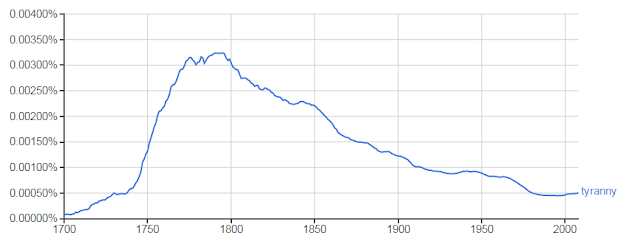 The use of the word "Tyranny" rises dramatically as the colonists decide to break away from the British. A steady decline in tyranny ever since the birth of United States America.